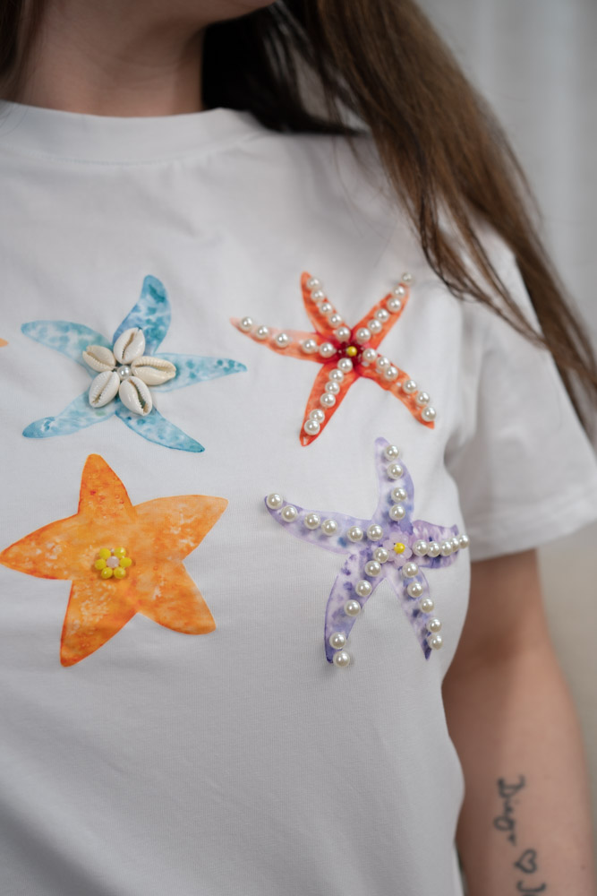 Ein hochwertiges T-Shirt mit aufgenähten Perlen und Muscheln.
