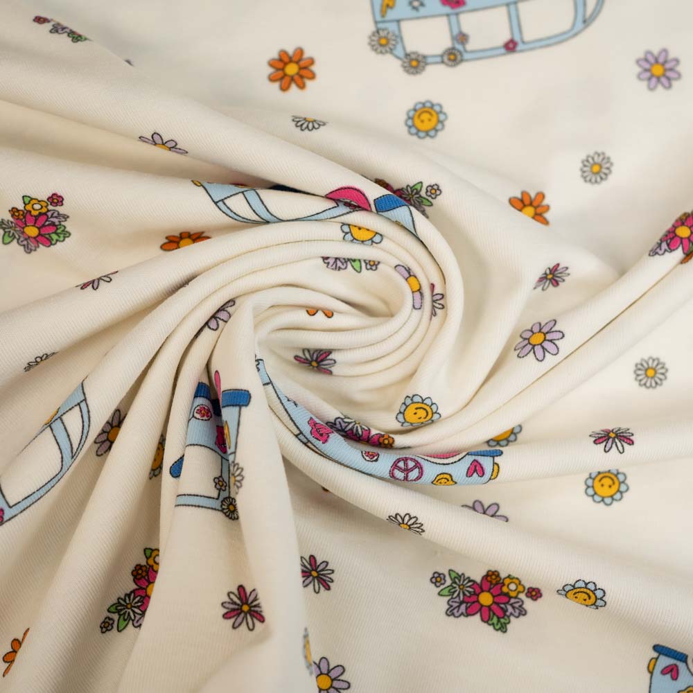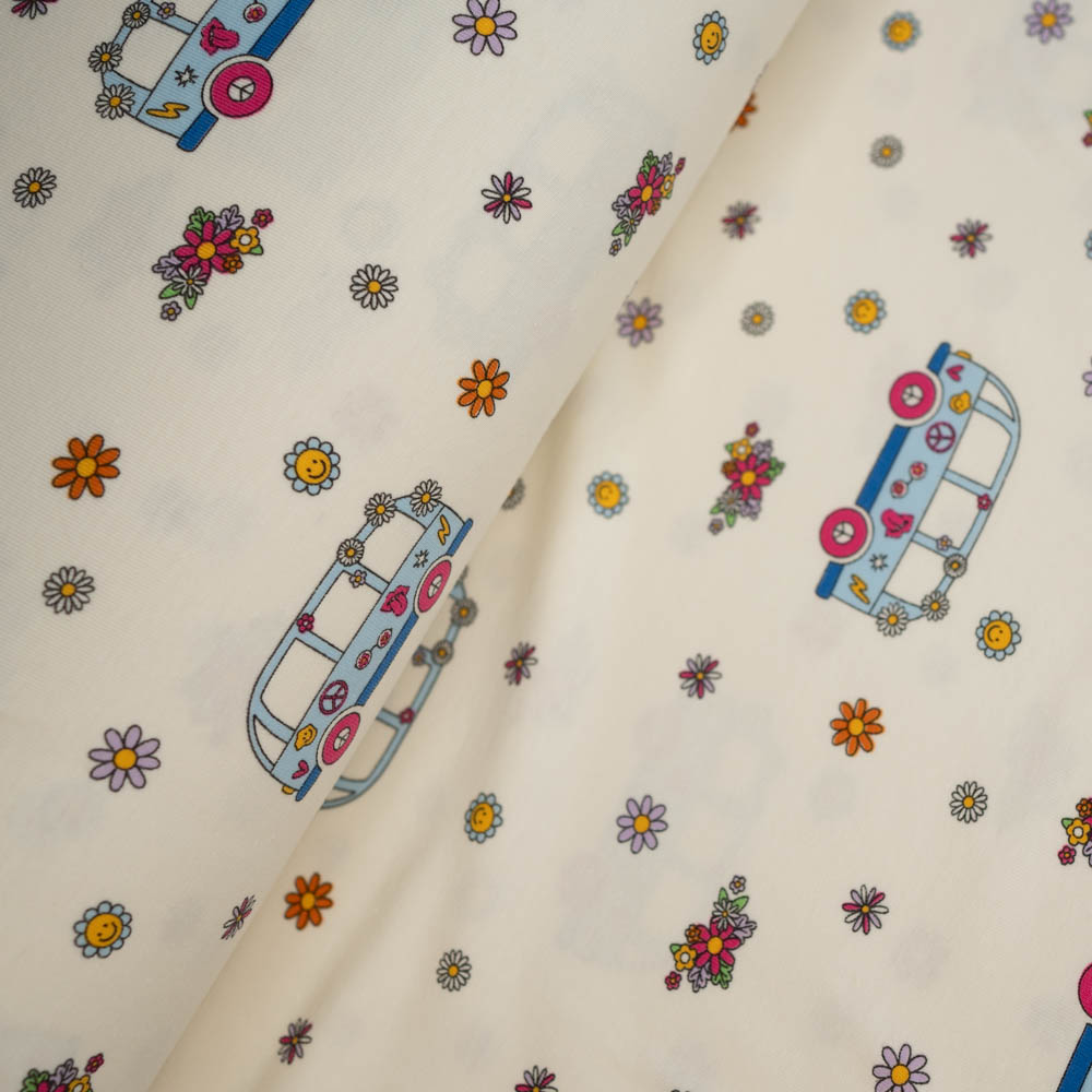Baumwolljersey Bulli & Flower Power ecru