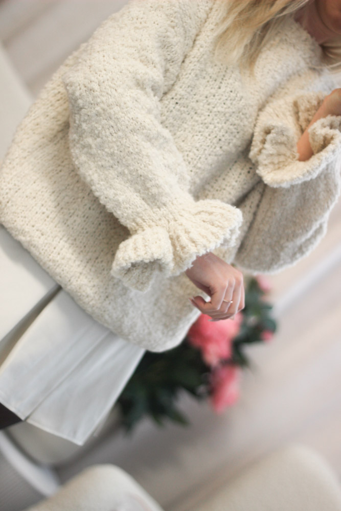 Schöner und super softer Bouclé Pullover mir trendigen Rüsschenärmeln in verschiedenen Farben.
