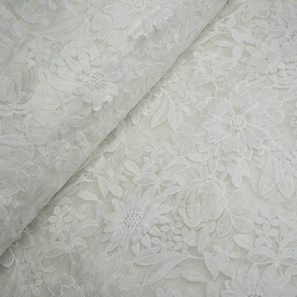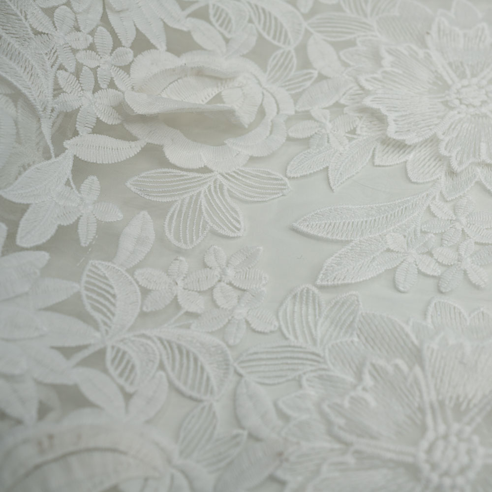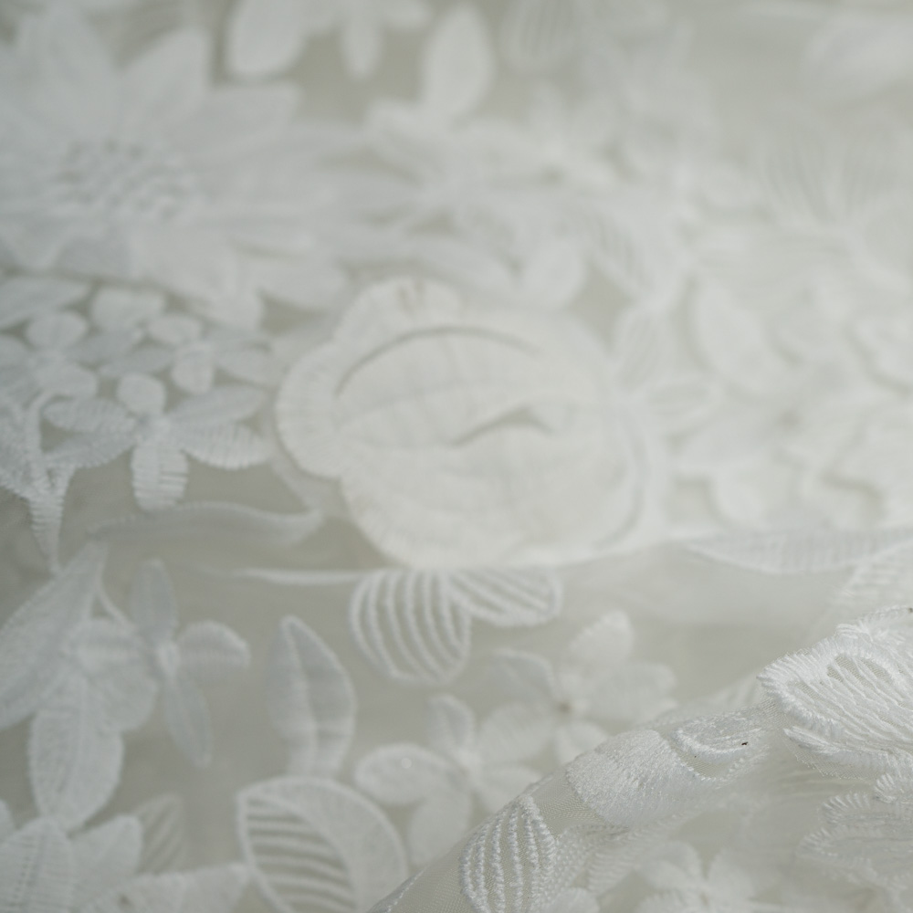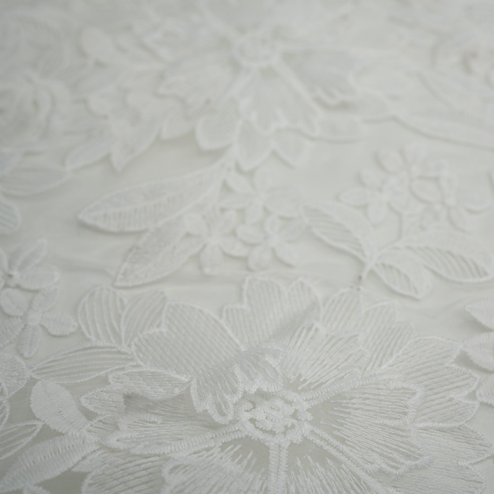 Diese hochwertige italienische Brautspitze besticht durch eine kunstvolle florale Bestickung. Vereinzelte 3D-Blüten setzen besondere Akzente und verleihen dem Stoff eine elegante Tiefe. Die aufwendige Stickerei sorgt zudem für eine leicht strukturierte, griffige Haptik.