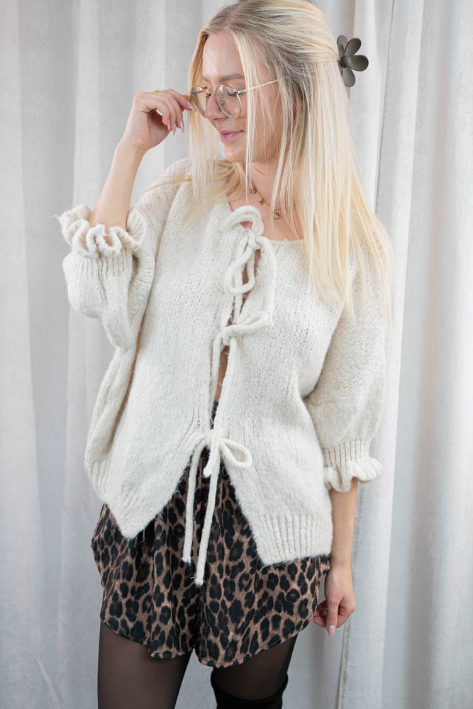 Super softer Oversize Strick Cardigan mit süßen Rüschenärmeln in 3/4 Länge und Schleifendetails - hergestellt in Italien.