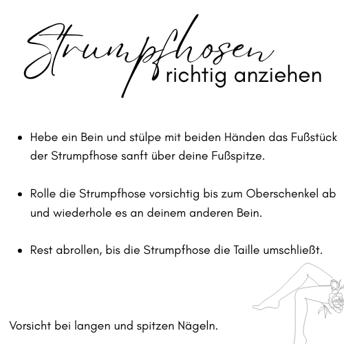 Die Strumpfhosen werden vor Versand auf Laufmaschen und Beschädigungen überprüft. Für eine längere Haltbarkeit empfehlen wir, auf spitze Finger- und Fußnägel zu achten, keine Reißverschlüsse an der Strumpfhose langzuführen und sie nur im Wäschebeutel zu waschen. Eine Reklamation aufgrund Beschädigung durch Eigenverschulden ist nicht möglich.