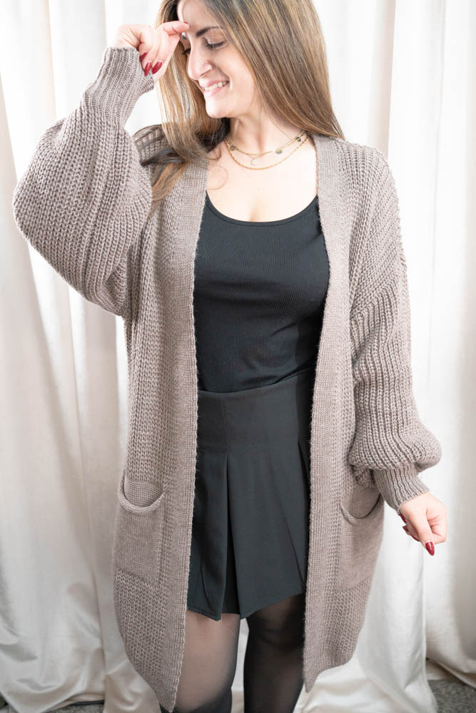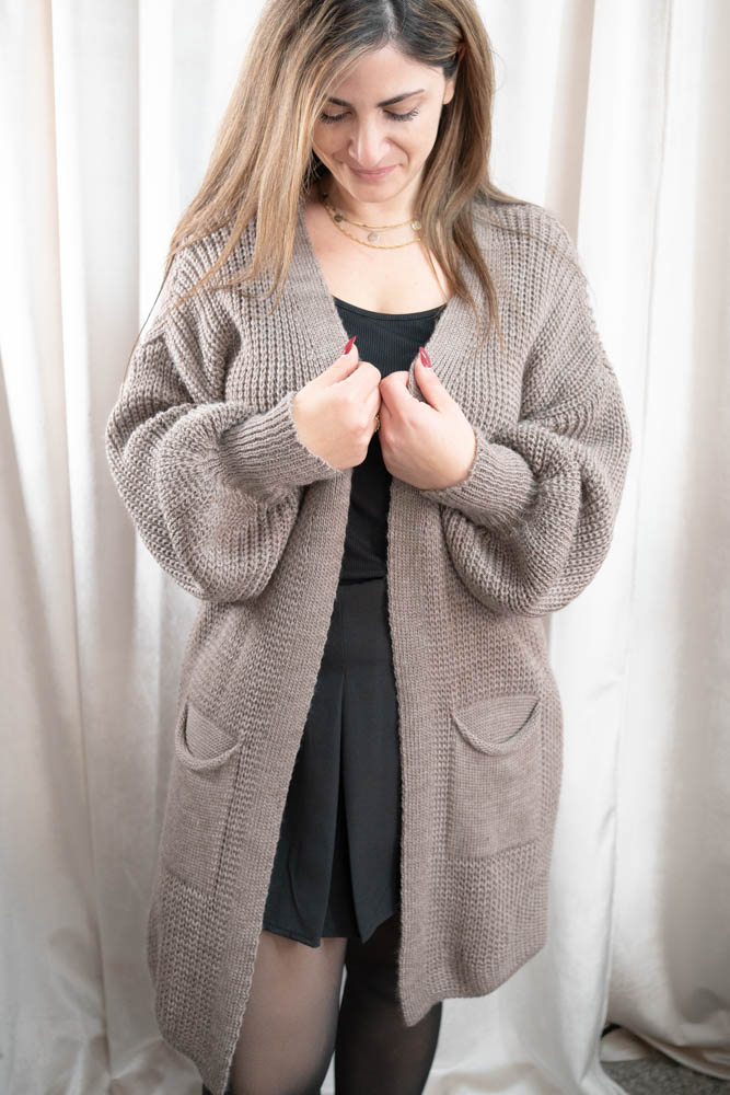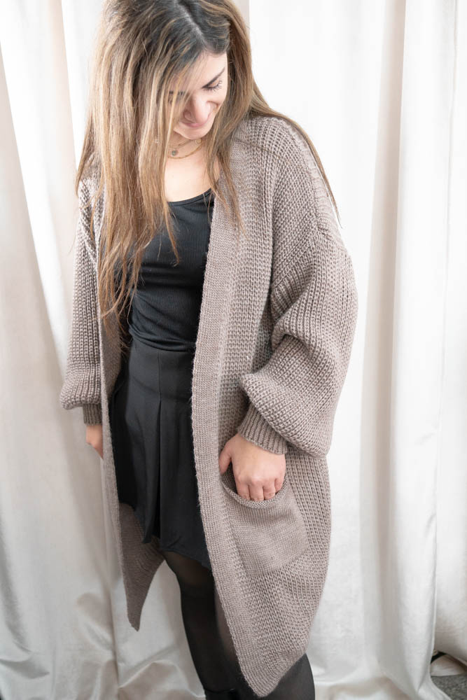 Weicher langer Strickcardigan mit Puffärmeln und Taschen.
