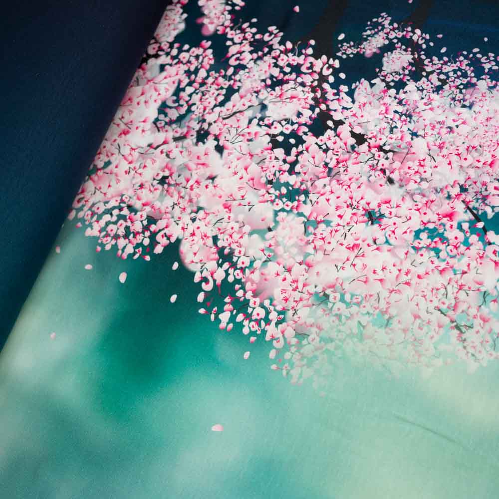 Unsere neue Eigenproduktion Rapport Japanische Kirschblüte bekommst Du auf besonders hochwertigem Baumwolljersey. Das bedeutet für dich: