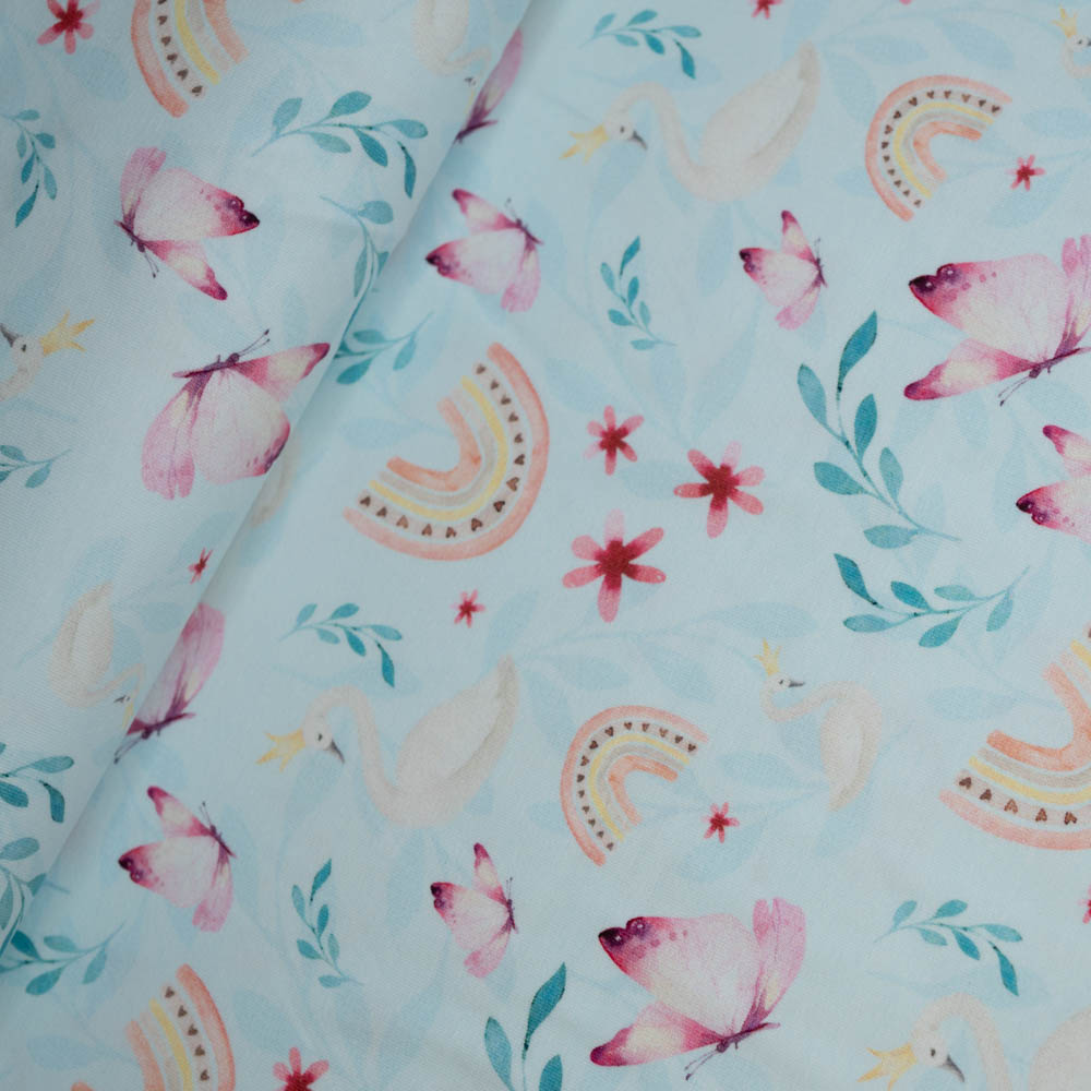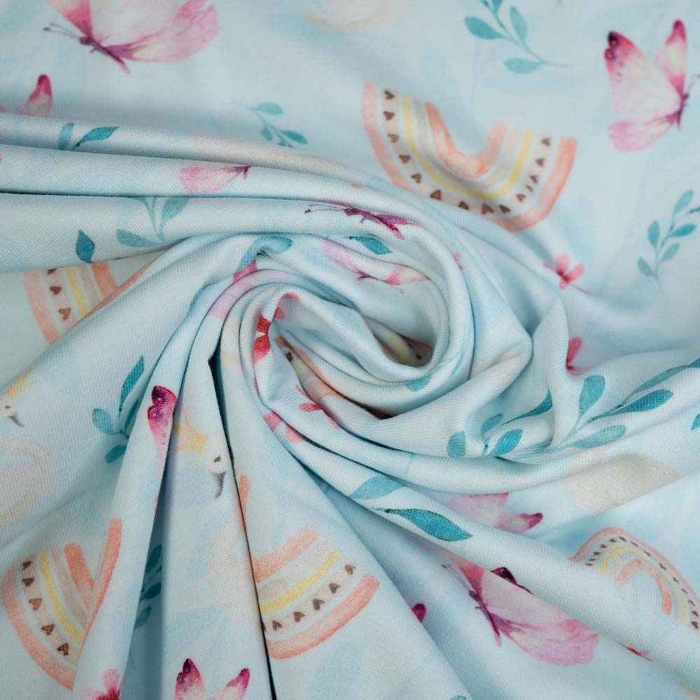 Baumwolljersey Schmetterlinge & Regenbogen hellblau