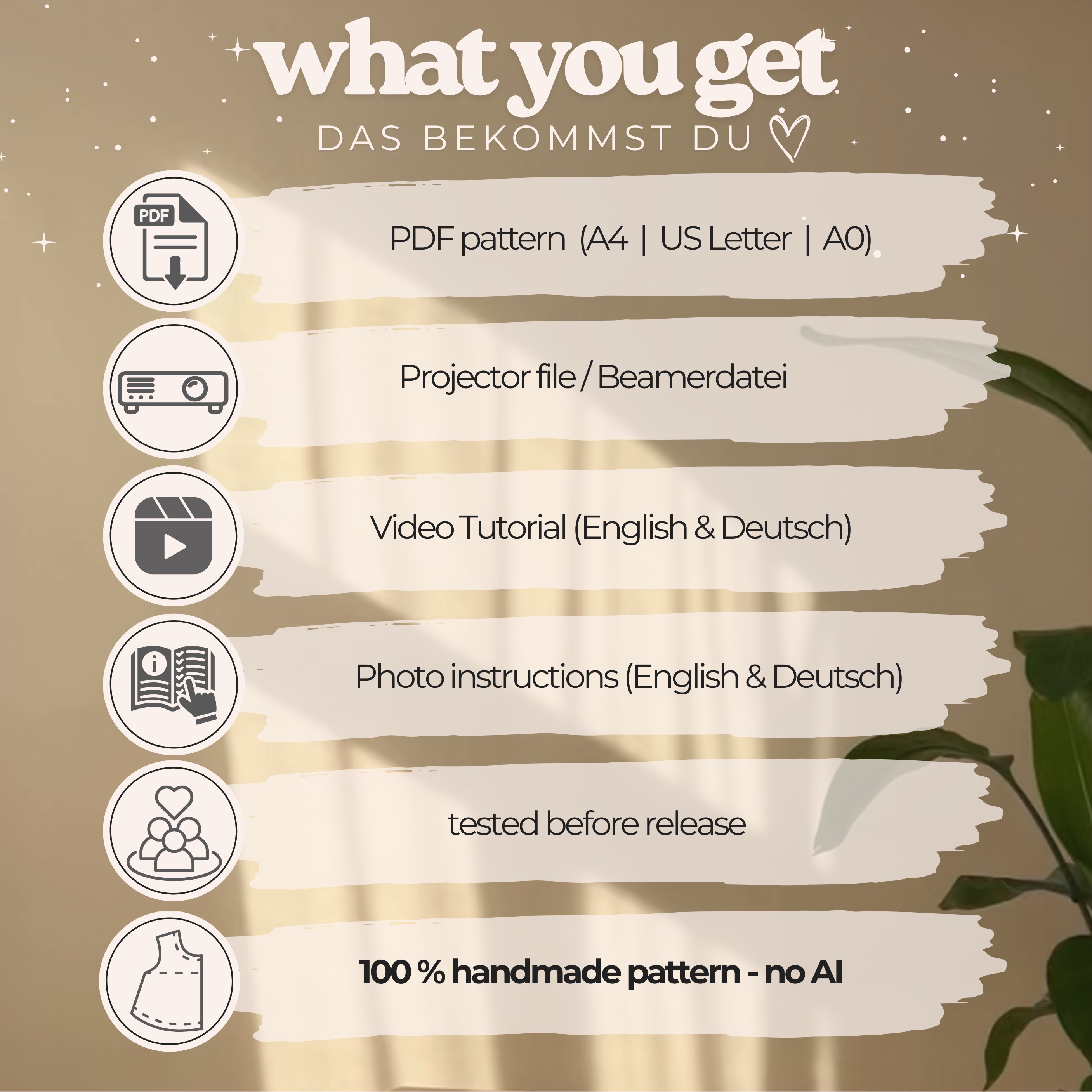 Etwa 2/5 - perfekt für Anfänger mit Grundkenntnissen. Schau dir gern vorab das Videotutorial zum Schnittmuster an, dort kannst du alle Schritte sehen und für dich einschätzen.