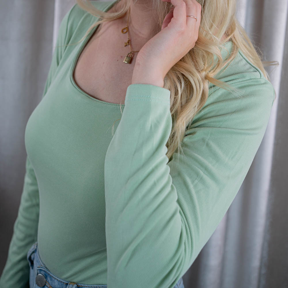 Eng geschnittener softer Feinripp-Body mit Trapez Ausschnitt. Doppellagig am Ausschnitt und unten mit Haken verschließbar.