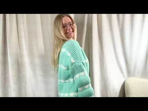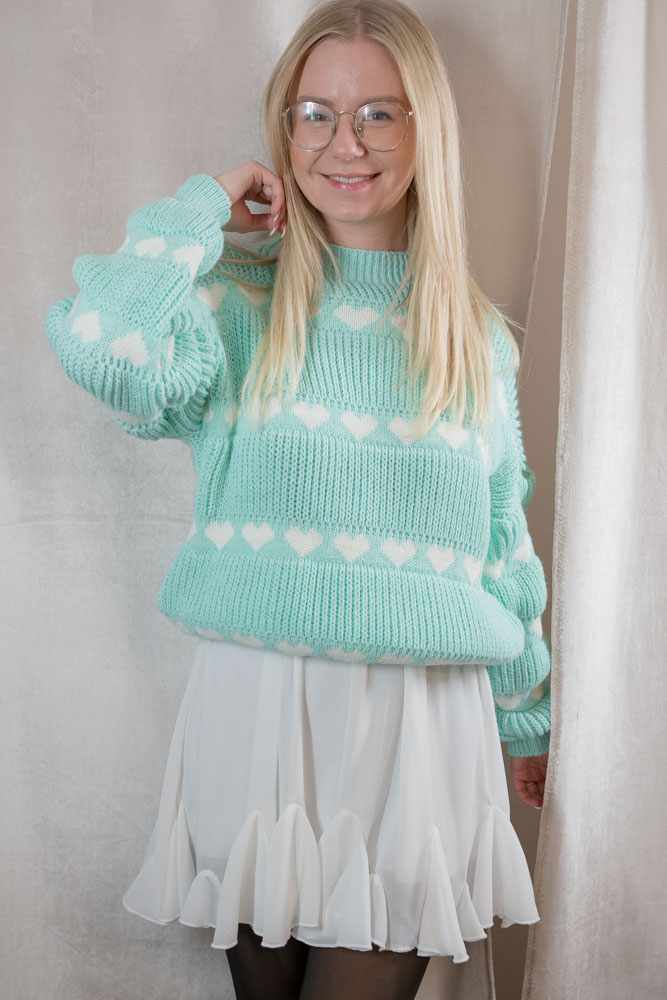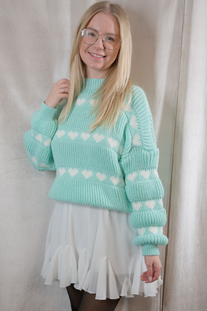 Ein schöner dicker Strickpullover mit Streifen und eingestrickten Herzchen verziert.