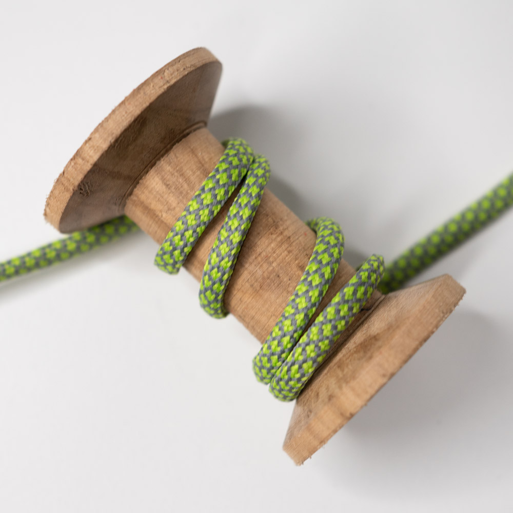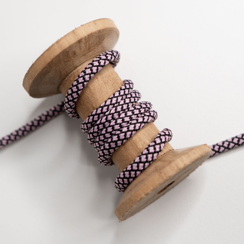 Gestrickte Kordel aus 100% Polyester. Im Griff sehr weich und biegsam.