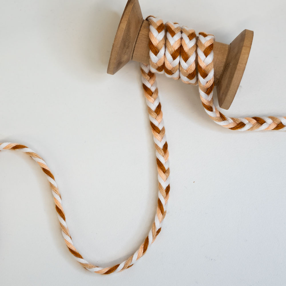 Diese Flachkordel, geflochten aus vier Farben ist im Griff sehr weich und aus 100% Baumwolle.