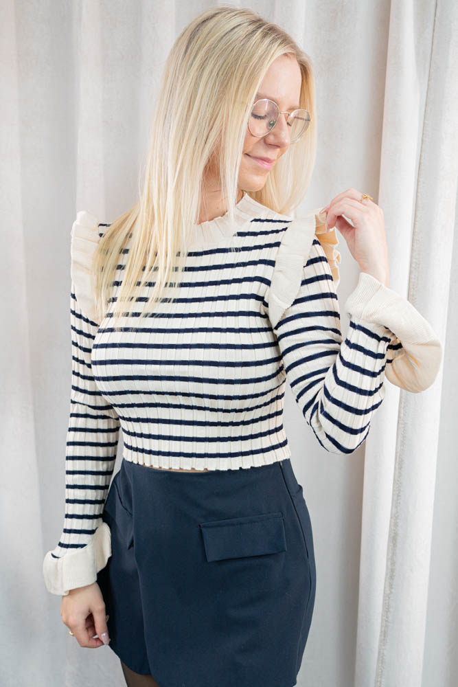 Super schönes Langarmshirt aus Rippstrick mit Schülter- und Ärmelvolants in Crop-Länge.