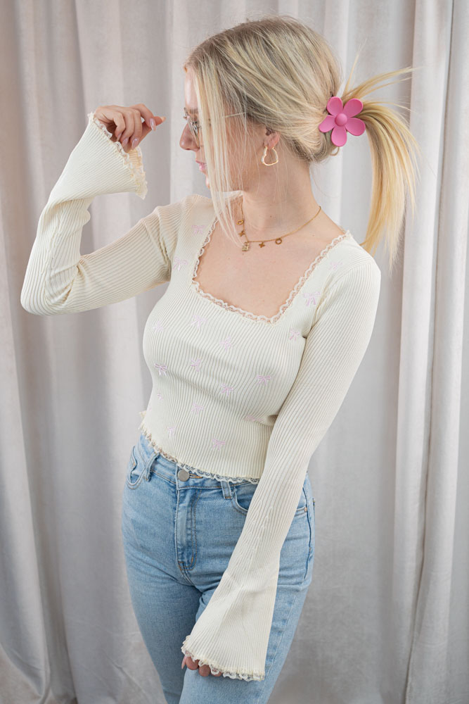 Super schönes Langarmshirt aus Rippstrick mit Spitzen Details und Schleifchen Stickerei, sowie Trompetenärmel.