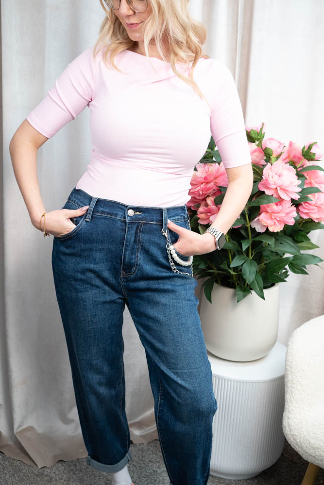 Eine super bequeme Jeanshose durch das Gummiband hinten am Bund. Die Perlenkette ist inklusive.