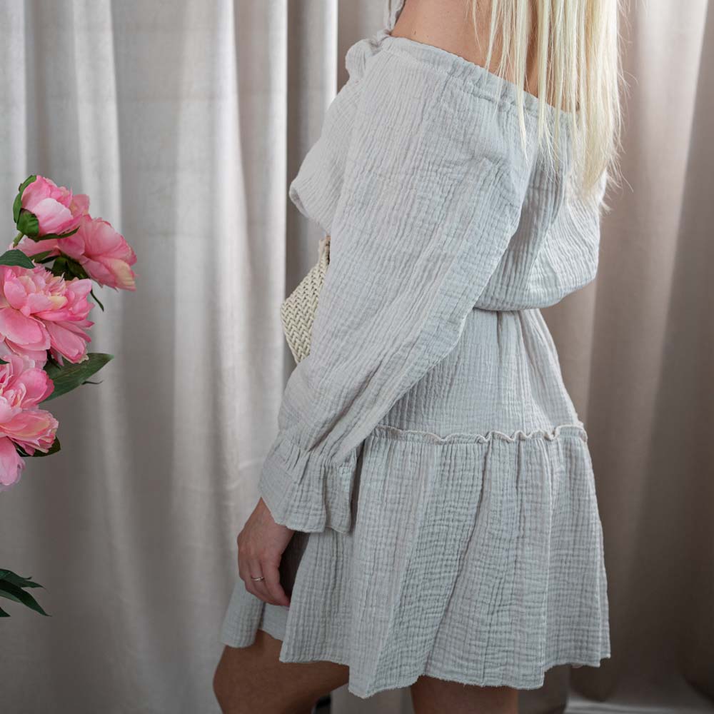 Traumhaftes Off-Shoulder Musselin Kleid mit Bindedetails am Ausschnitt.