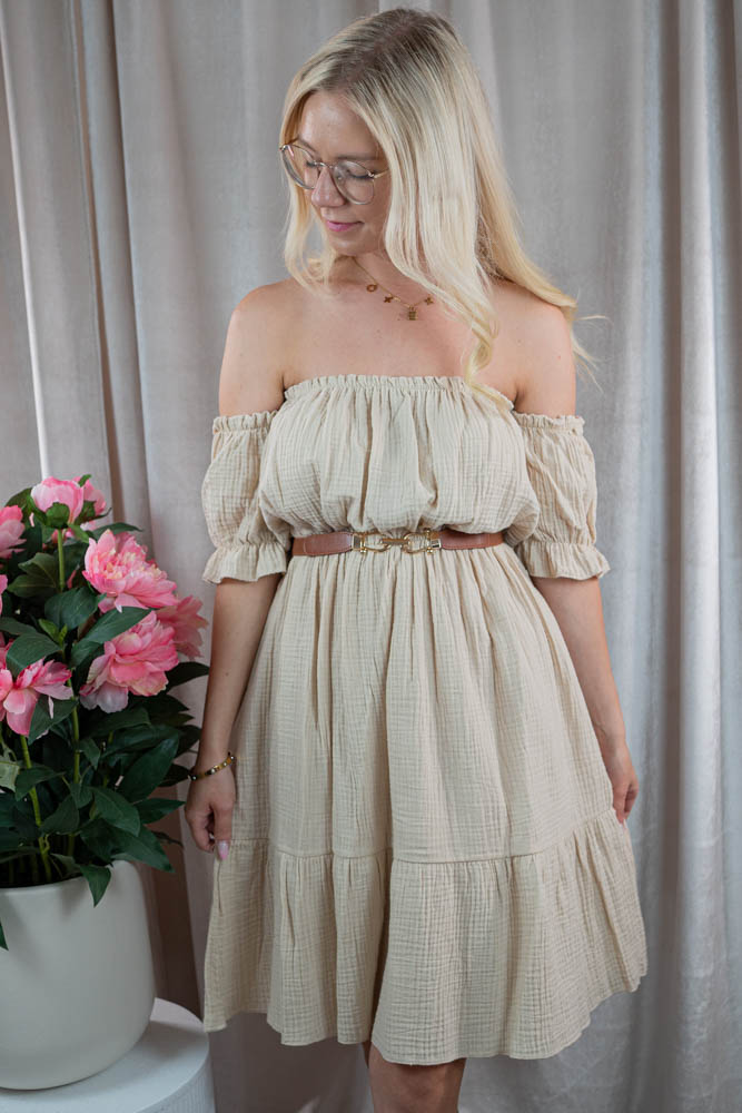Schönes Off-Shoulder Kleid mit Gummizug am Ausschnitt und an den Ärmeln.