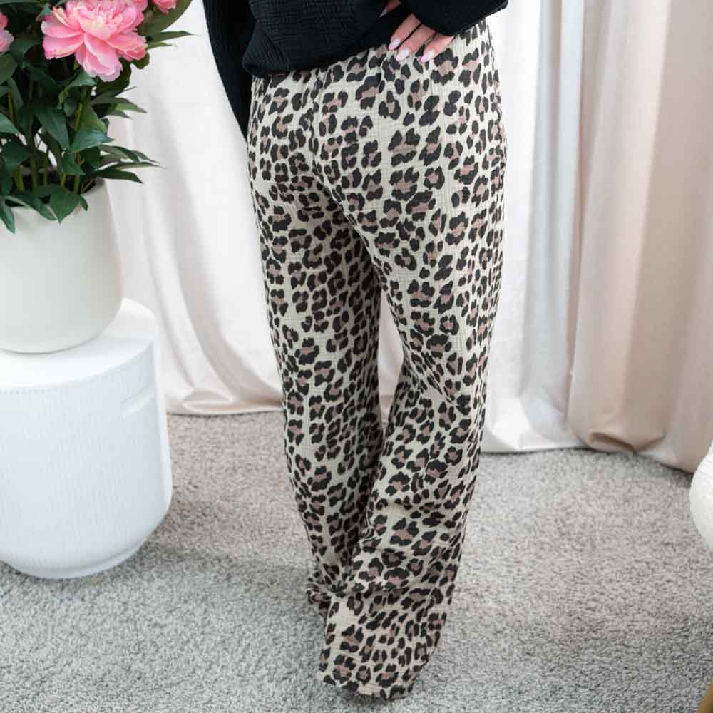 Weit geschnittene Musselin Hose im Leo-Design. Vorn zum Binden