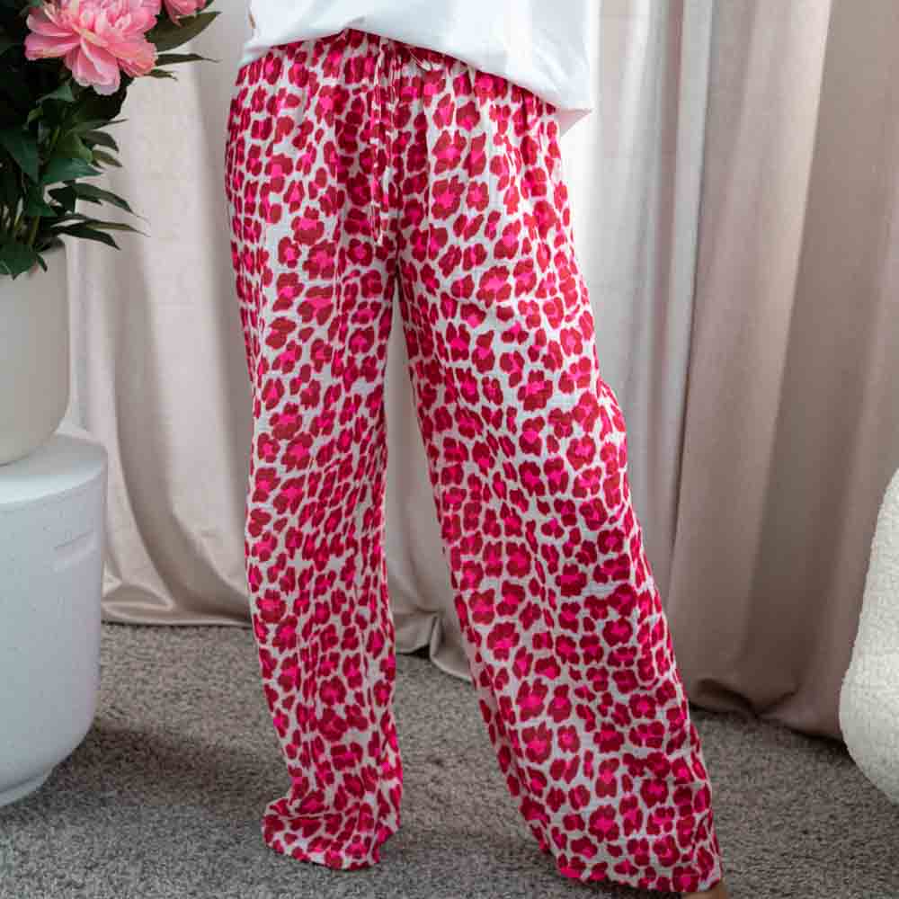 Weit geschnittene Musselin Hose im Leo-Design. Vorn zum Binden