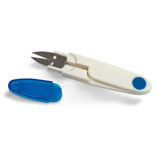 Ein hochwertig verarbeiteter Fadentrenner mit Schutzkappe. Nach Entfernen der Schutzkappe klappt sich der Fadentrenner auf und wird durch das Zusammendrücken bedient. Nach Benutzen wieder zusammendrücken und die Schutzkappe draufstecken.