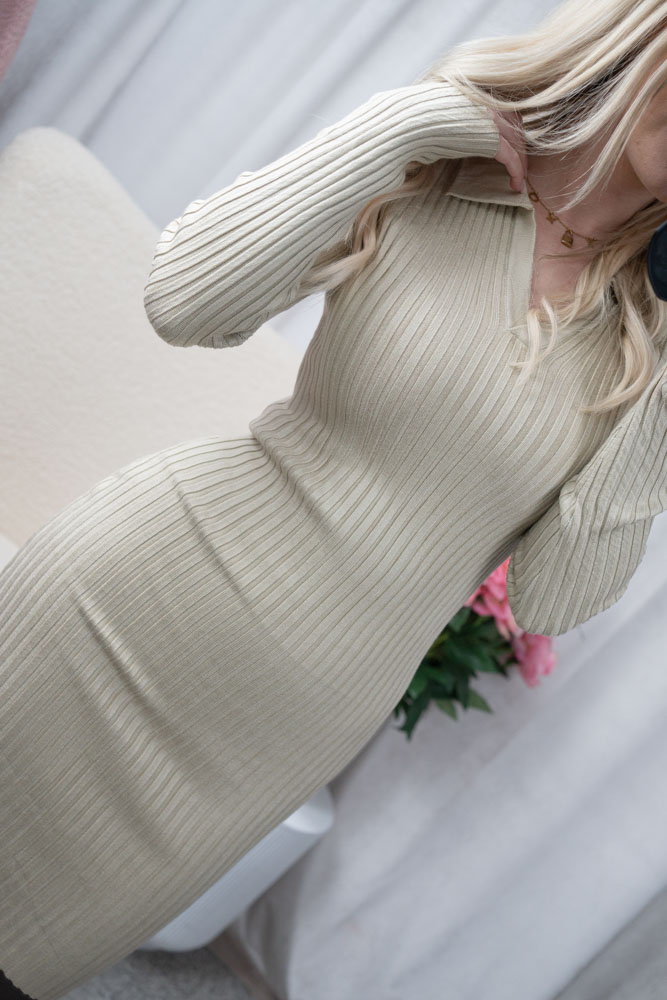 Super schönes eng anliegendes und sehr elastisches Ripp Strickkleid mit Polo Kragen und langem Ärmel.