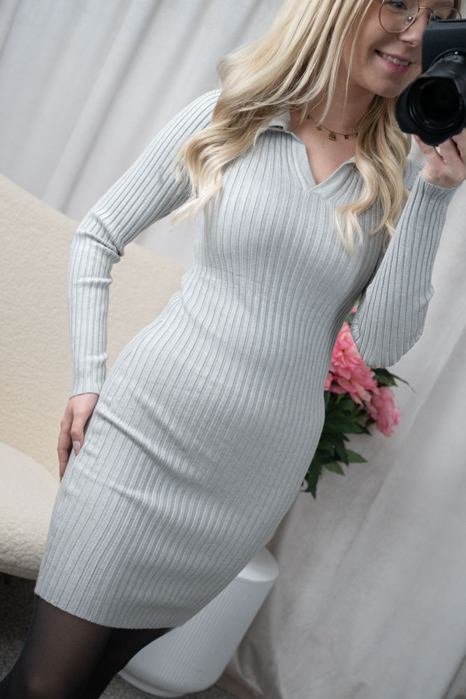 Super schönes eng anliegendes und sehr elastisches Ripp Strickkleid mit Polo Kragen und langem Ärmel.