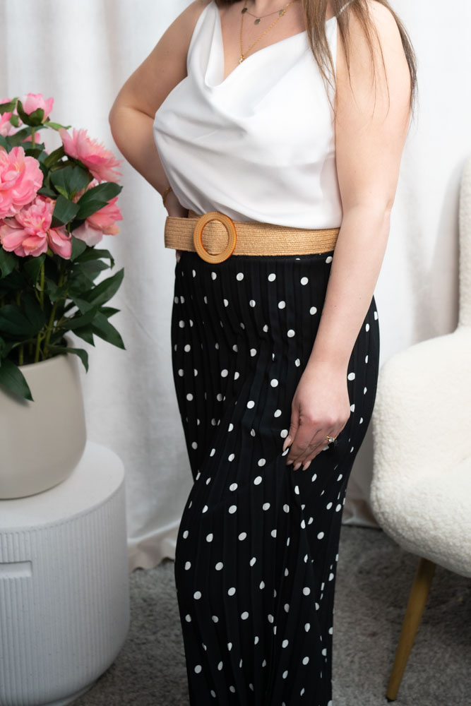 Weich fließendes Satin Top mit Wasserfall Ausschnitt und dünnen Trägern aus einem soften Gummi.