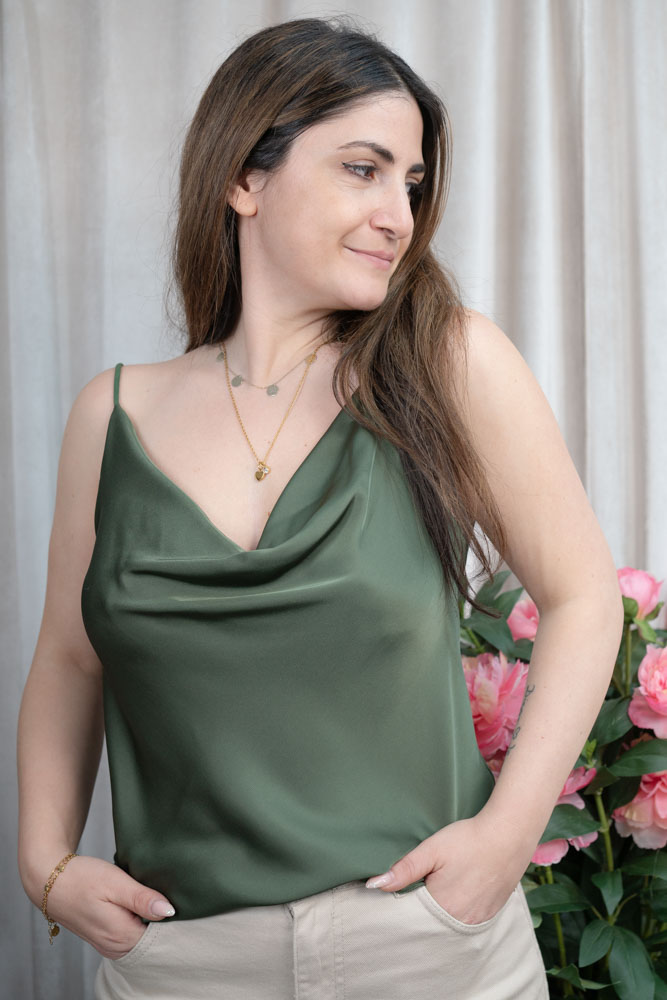 Weich fließendes Satin Top mit Wasserfall Ausschnitt und dünnen Trägern aus einem soften Gummi.