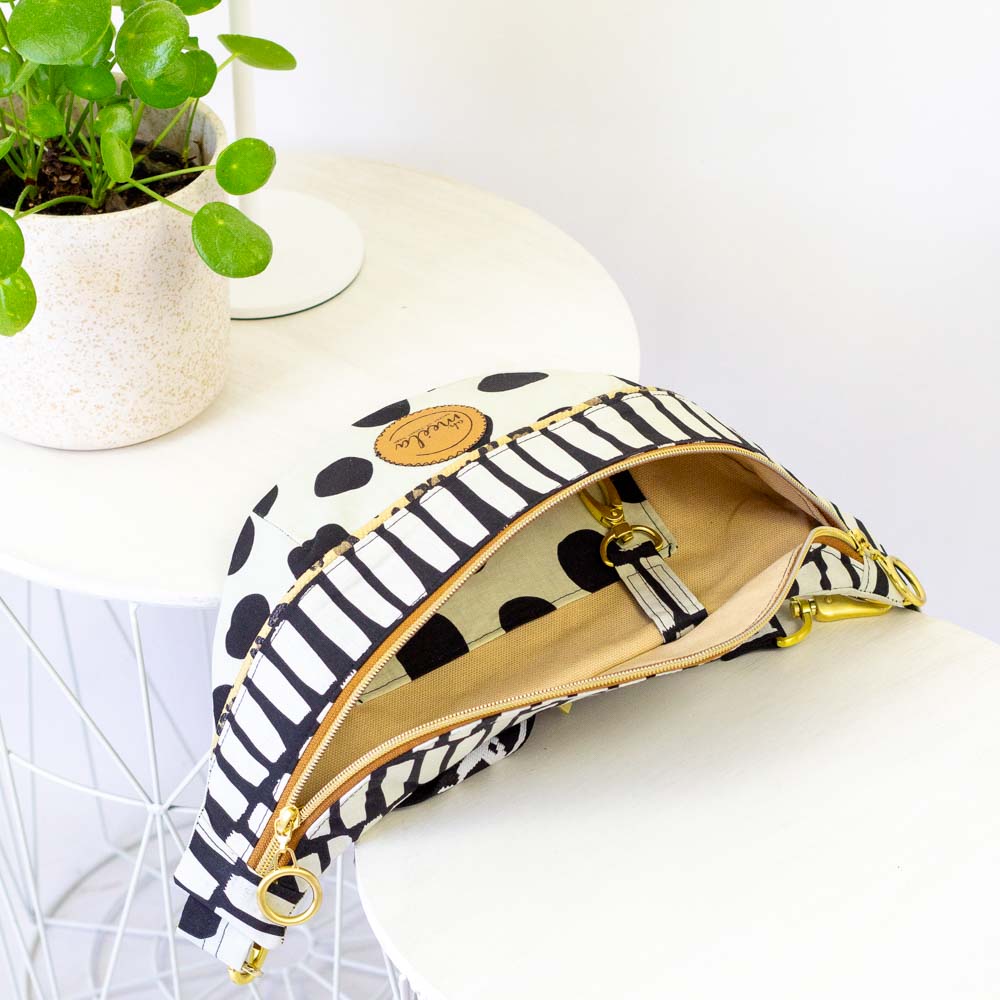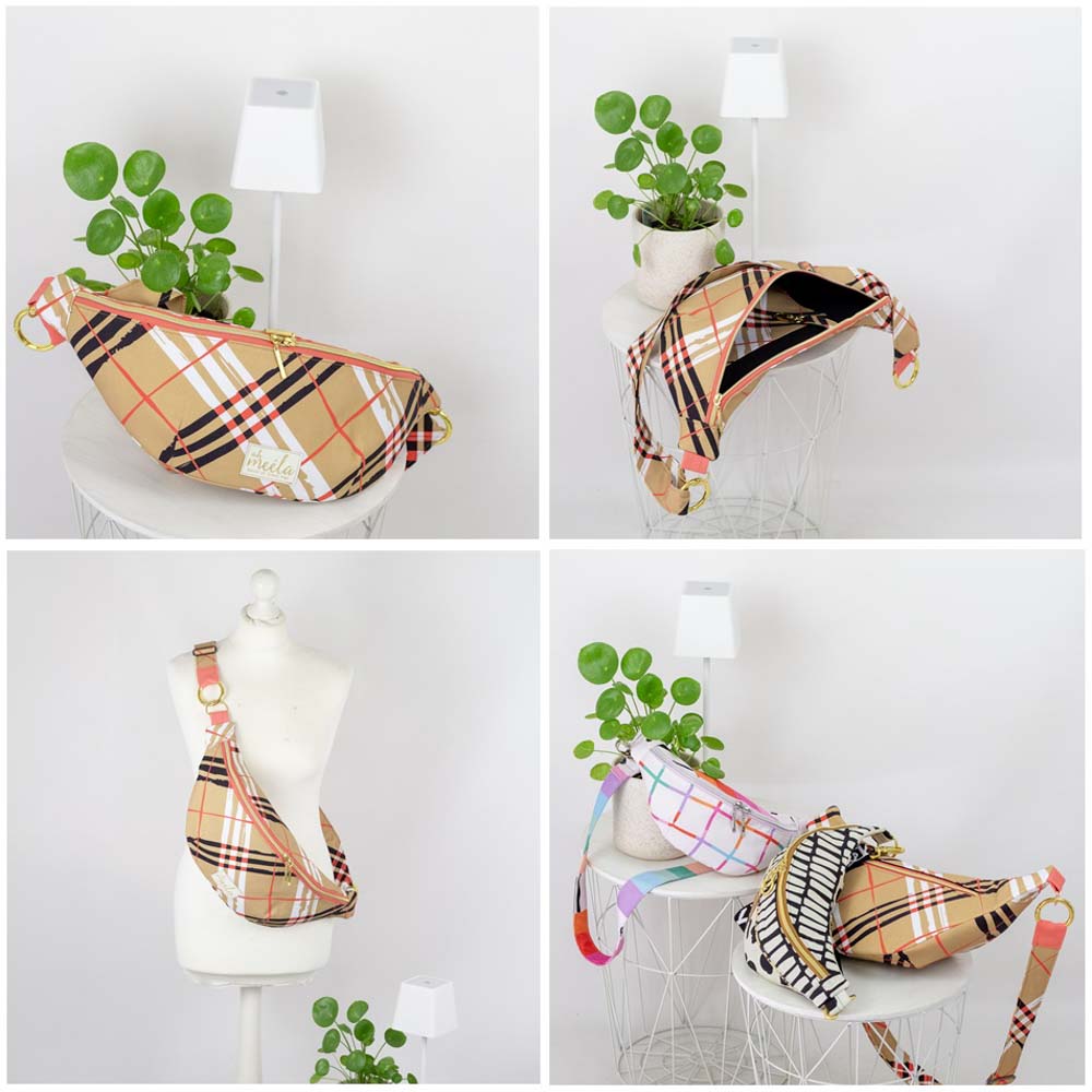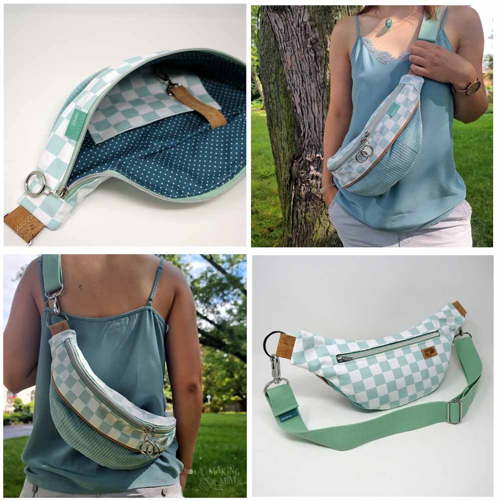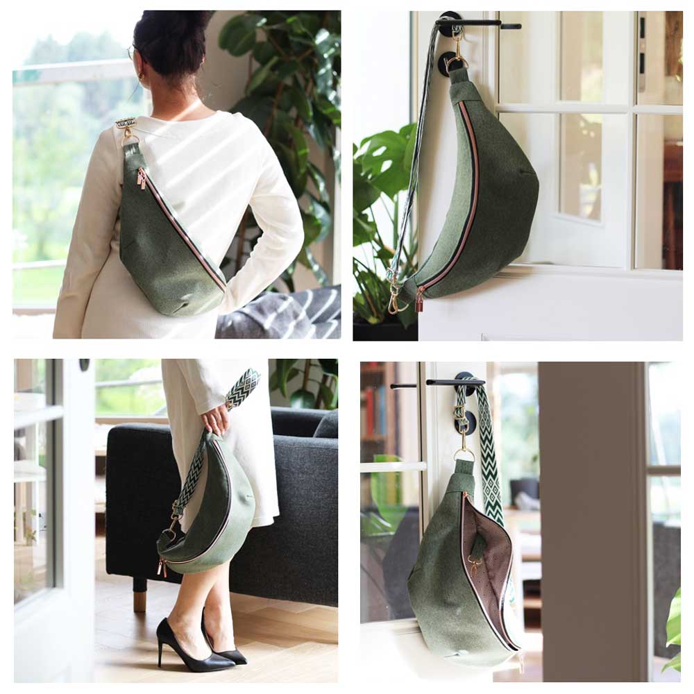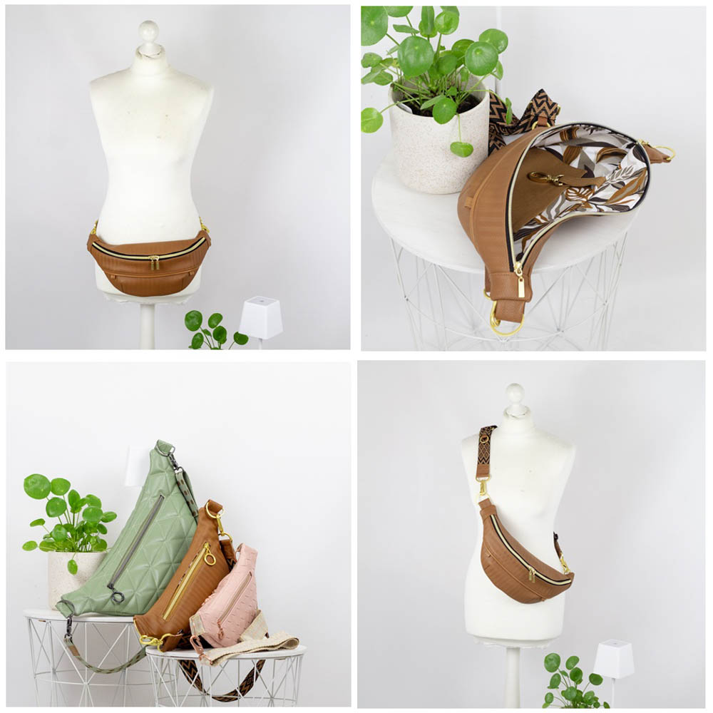 Crossbody oder um den Bauch lässig mit fertigem oder eleganter mit selbstgenähtem Tragegurt.