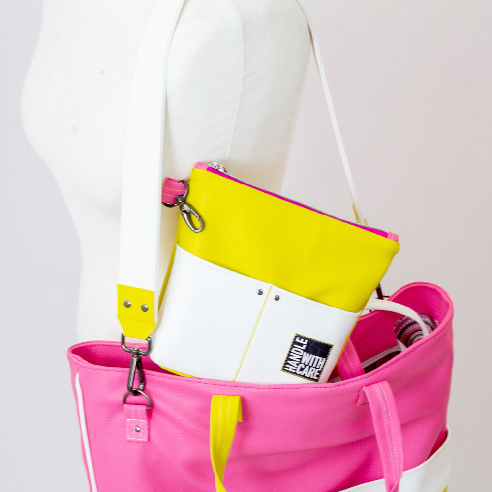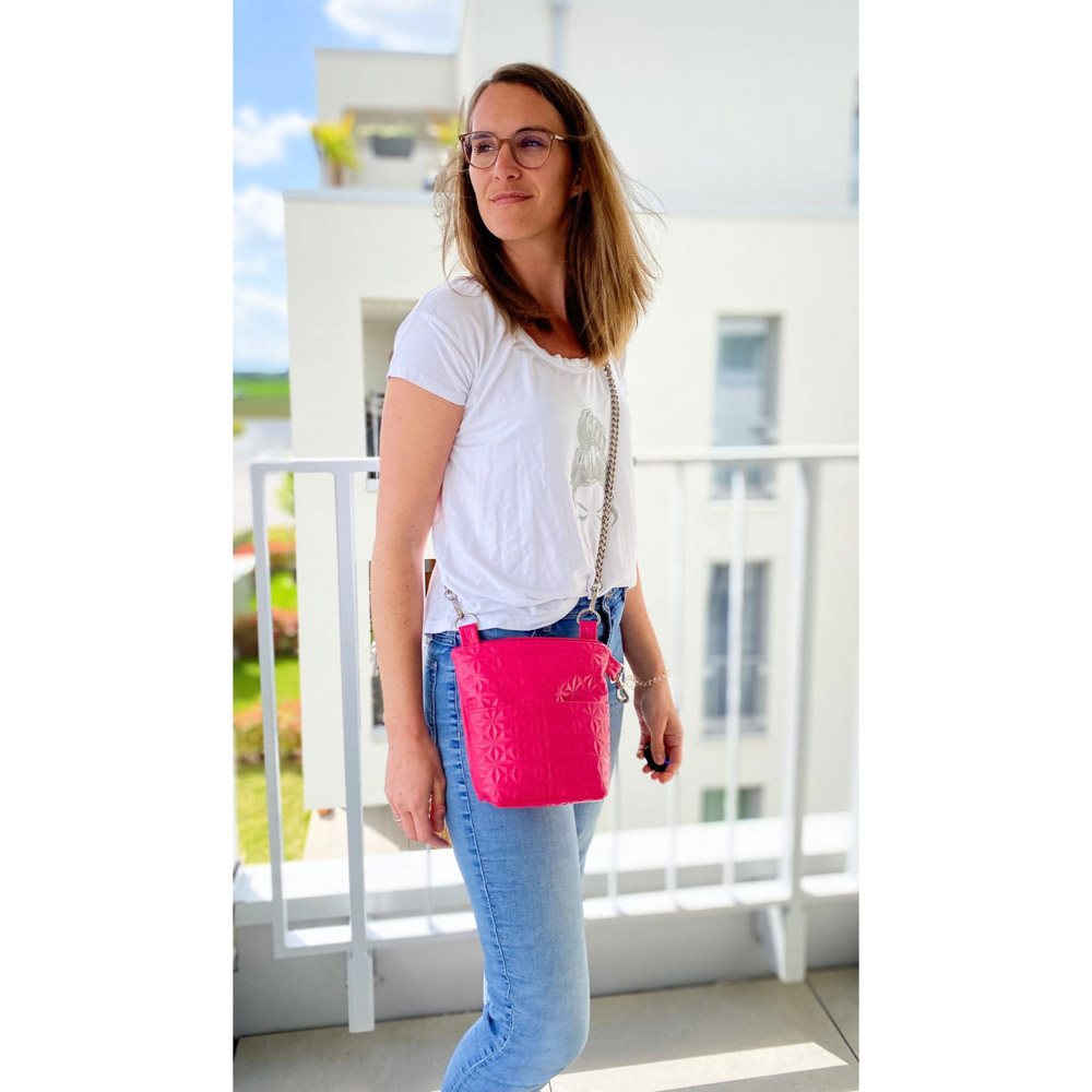 ohMaggiii Mini, ein zuckersüßes Micro-Täschchen mit Hingucker-Einsteckfach. ohMaggiii kannst du je nach Option als Crossbag tragen, als Zusatztäschchen an deiner Handtasche/Shopper oder als praktisches „In-der-Tasche-Täschchen“ für Kosmetikartikel, Desinfektion, Maske etc. nutzen. Geschlossen wird ohMaggiii Mini mit einem Reißverschluss.