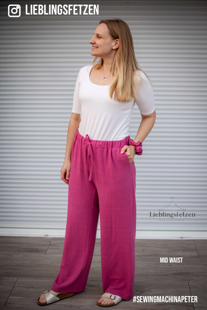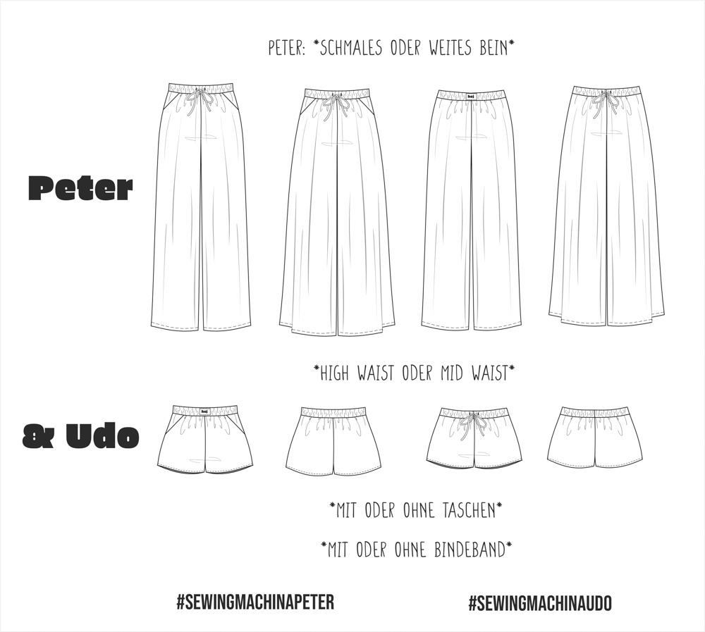 Peter und Udo haben zwei Leibhöhen (high waist und mid waist), werden mit einem elastischen Bund und optional Taschen sowie einem optionalen Bindeband verarbeitet.