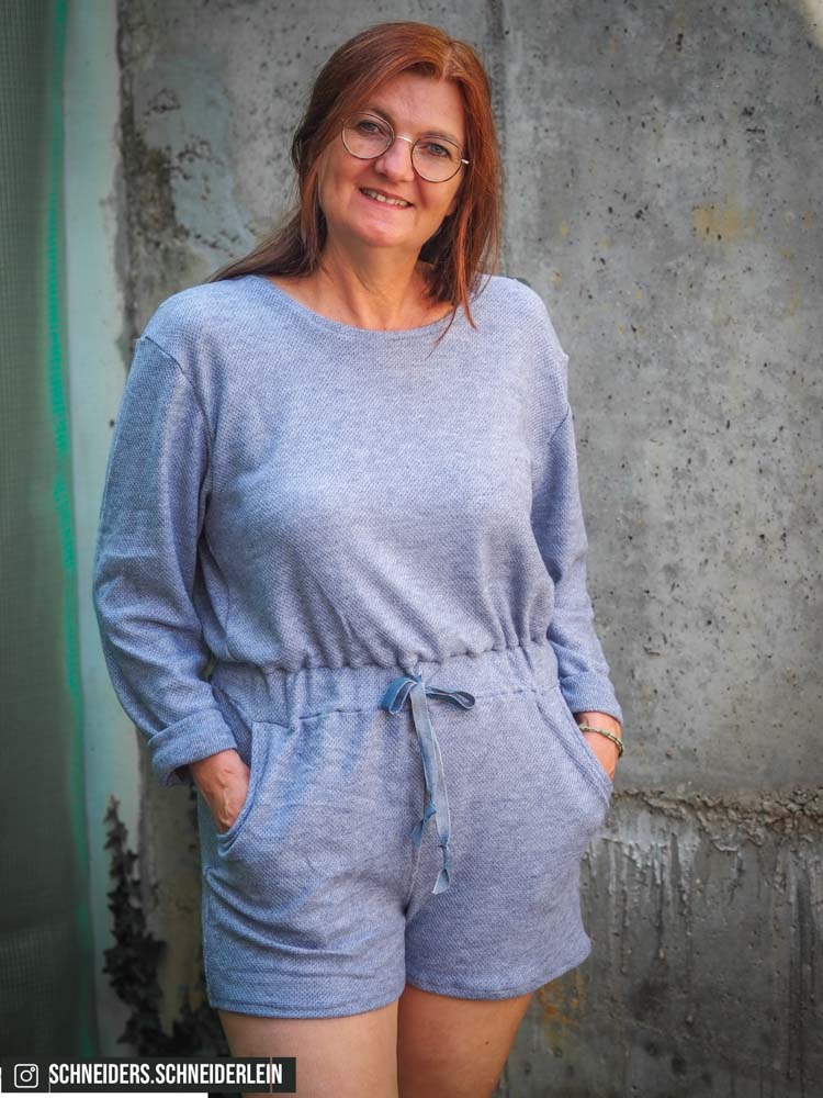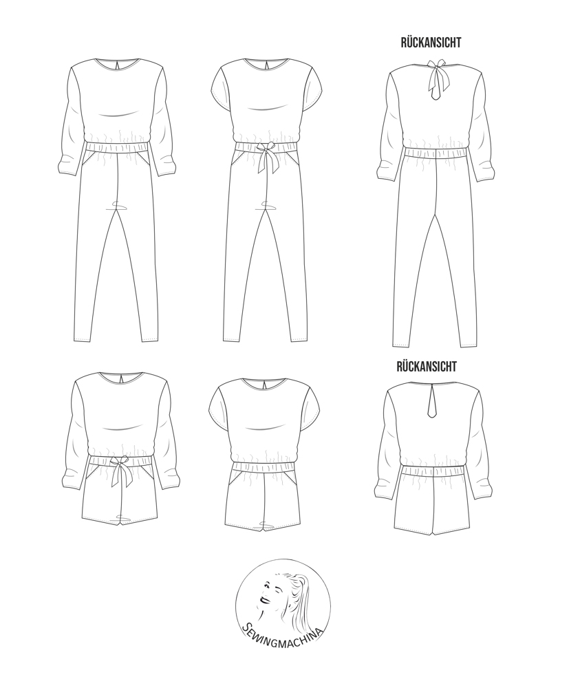 Mit diesem Schnittmuster kannst du dir selbst einen gemütlichen Overall nähen. Je nach Stoffauswahl und Variante kann er ein gemütlicher Overall für Zuhause oder ein cooler und alltagstauglicher Begleiter sein. Wähle zwischen langen oder kurzen Ärmeln, der langen oder kurzen Hose. Durch den Tropfenverschnitt am Rücken sparst du das Einnähen eines Veschlusses, sodass der Schnitt auch problemlos von Anfängern genäht werden kann.