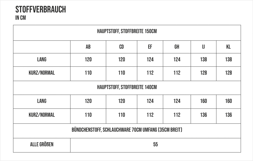 Der Schnitt ist in 6 Doppelgrößen erhältlich, siehe dazu die Größentabelle.