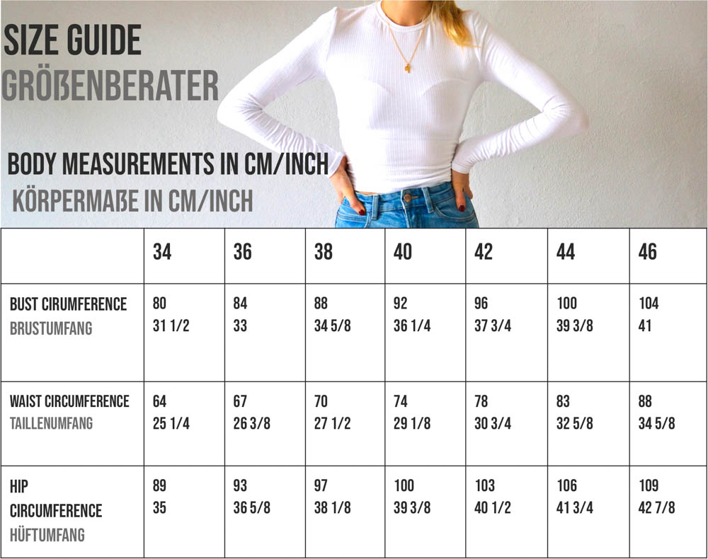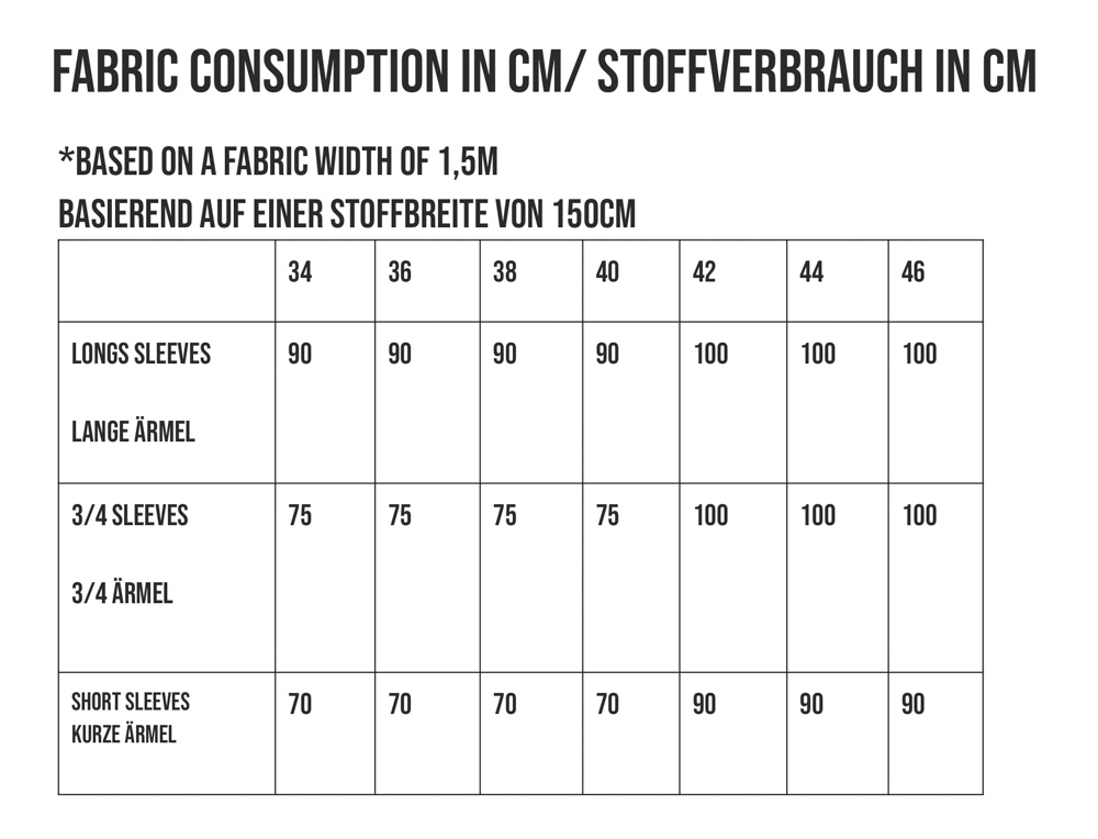 Der Schnitt enthält die Größen 34 bis 46, bitte siehe dazu die Größentabelle.