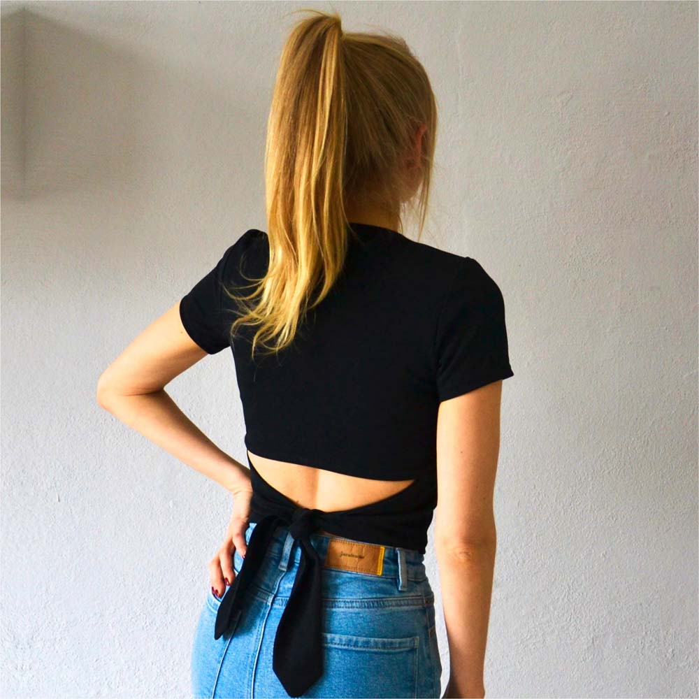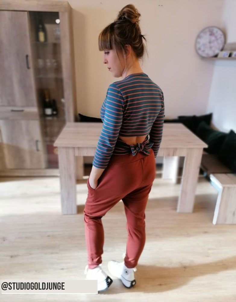 Mit diesem Schnittmuster kannst du dir selbst ein süßes Shirt mit Rückendetail nähen. Durch die drei verschiedenen Ärmellängen (kurz, ¾ und lang) passt es super für Frühjahr und Sommer und kann problemlos mit einem BH drunter getragen werden.