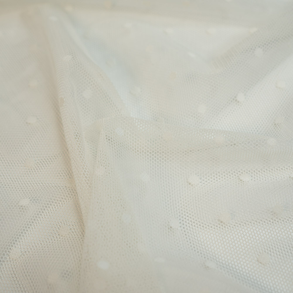 Dieser elastische Mesh ist besonders weich und fühlt sich angenehm auf der Haut an. Mit seinem geflockten Pünktchen Design eignet er sich perfekt für die Herstellung von Kleidung.