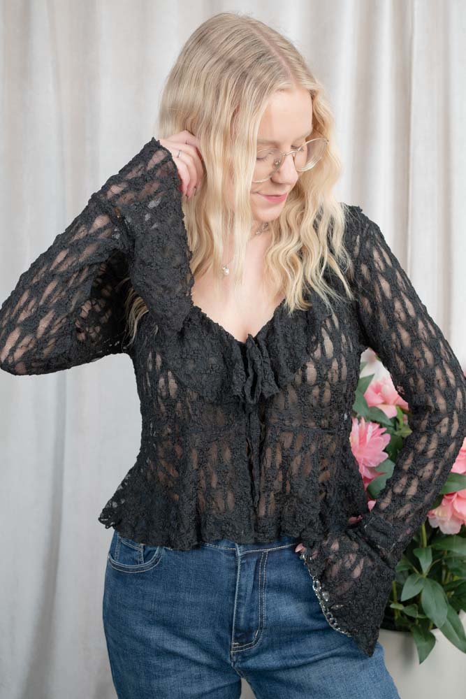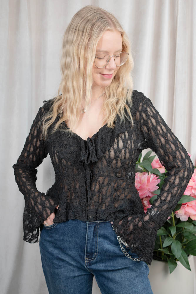 Transparentes und elastisches Spitzenshirt mit langen Ärmeln und Volants zum Binden.