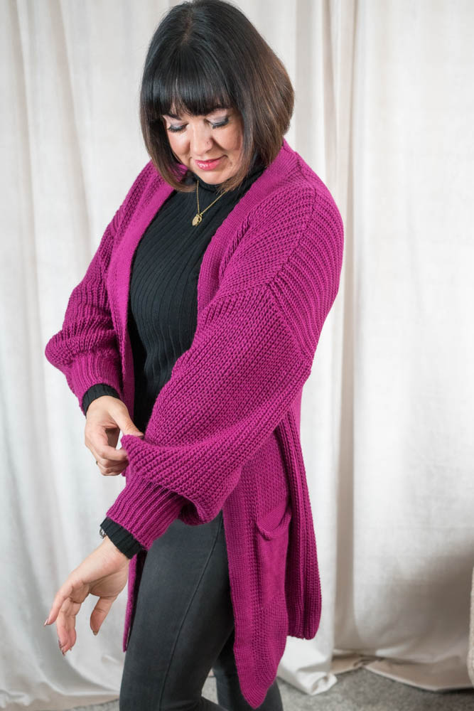 Weicher langer Strickcardigan mit Puffärmeln und Taschen.
