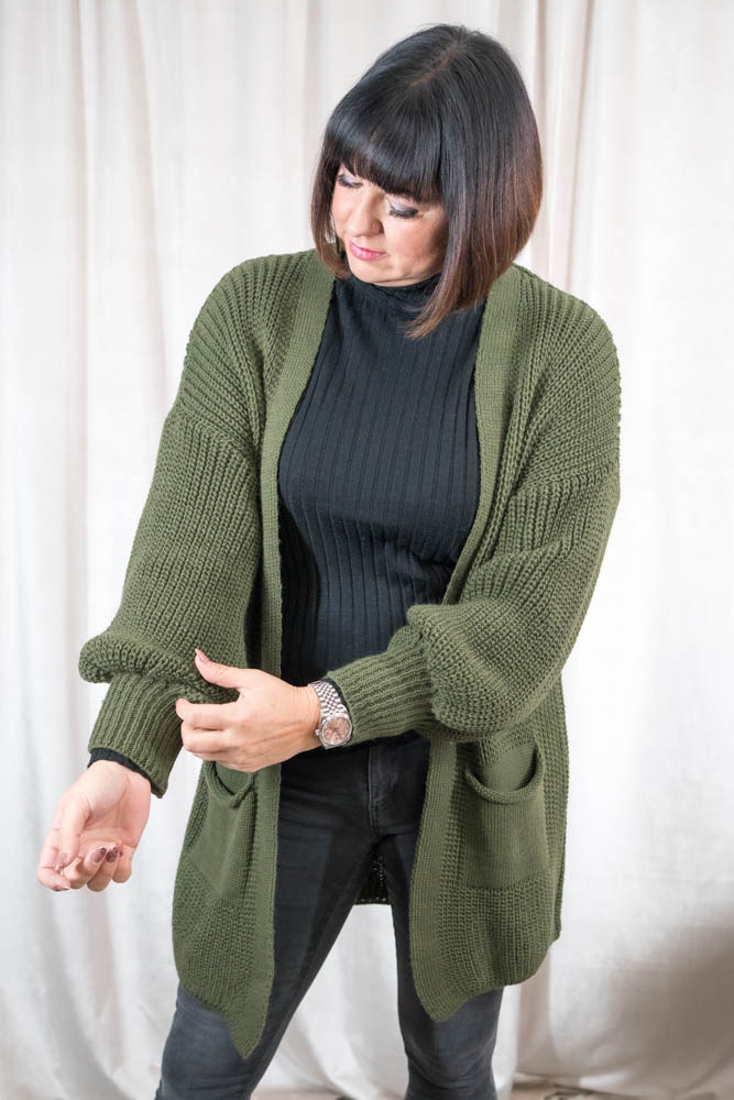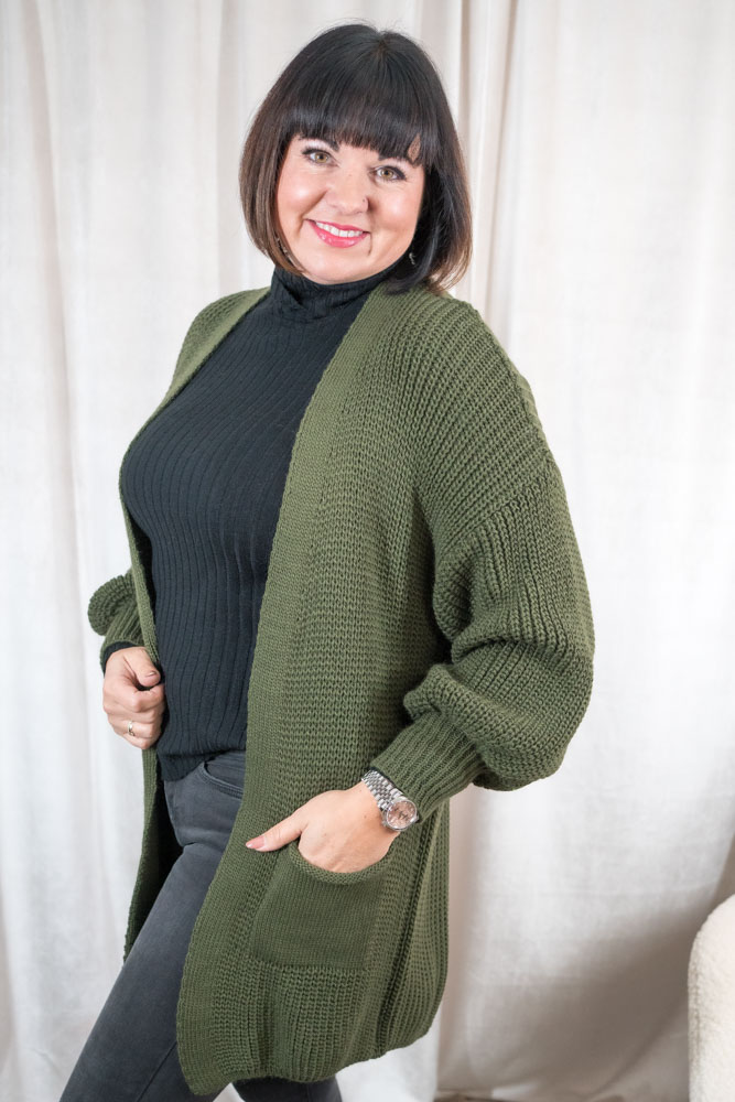 Weicher langer Strickcardigan mit Puffärmeln und Taschen.
