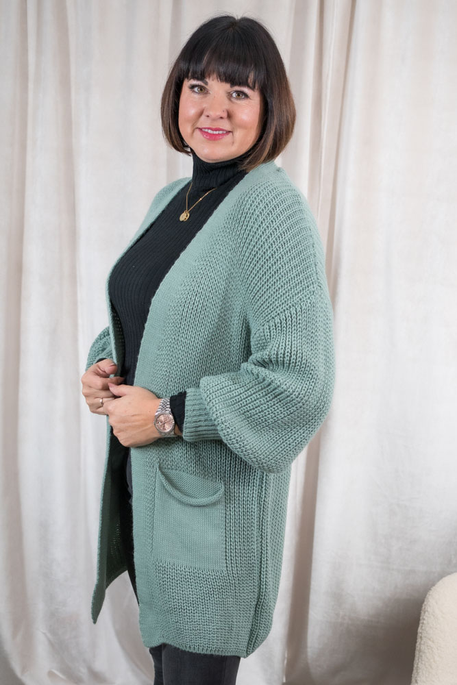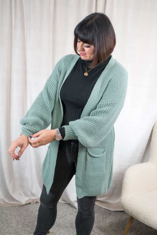 Weicher langer Strickcardigan mit Puffärmeln und Taschen.