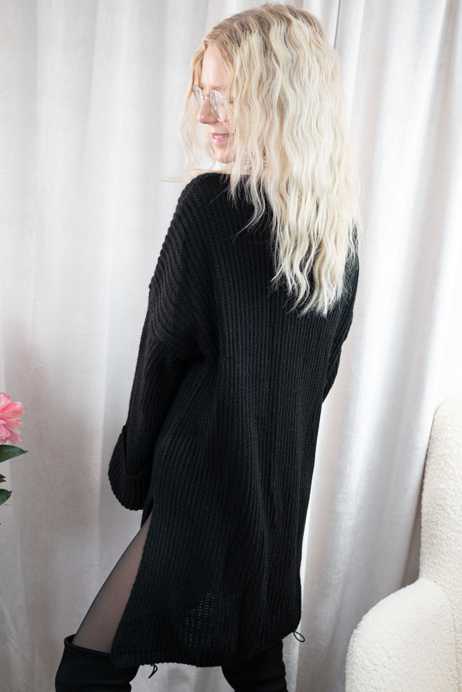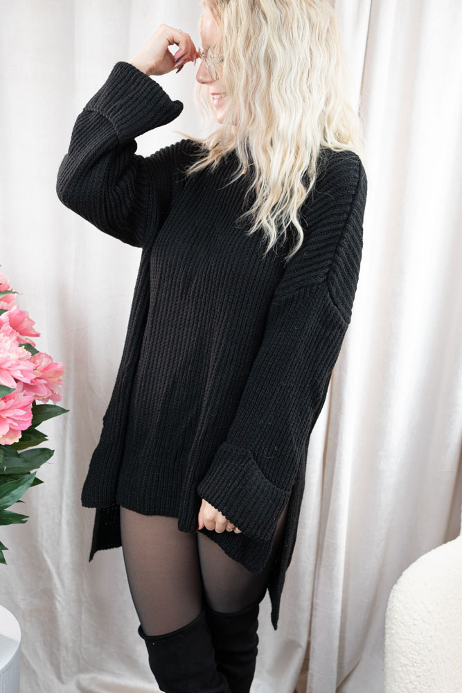 Schönes Strickkleid in Vokuhila Länge mit seitlichem Schlitz und Ärmel mit Krempeleffekt. Auch als Pullover tragbar.