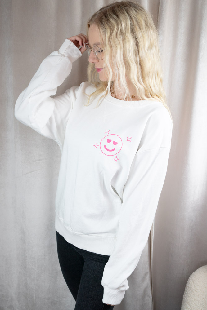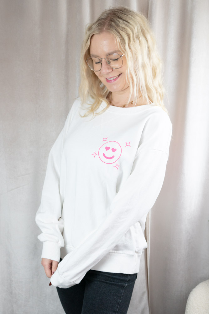 Schöner Sweater im Washed Look mit Front- und Backprint - hergestellt in Italien. Artikel bitte auf links waschen.