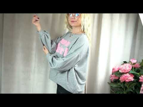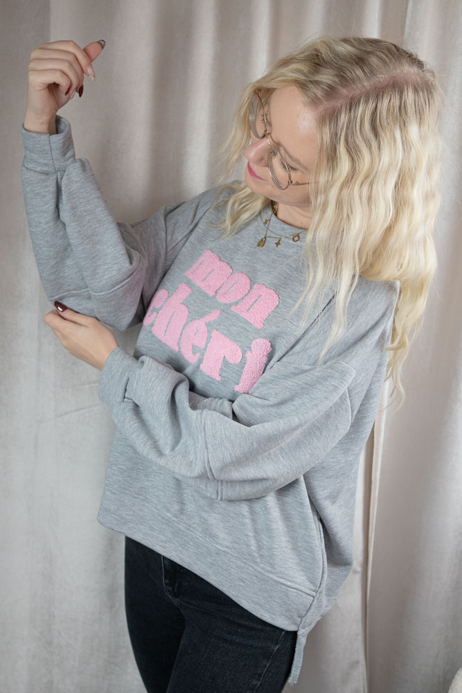 Schöner Sweater mit "Mon Cherí"-Applikation in Teddy Optik und lässig geschnittenem Ärmel - hergestellt in Italien.