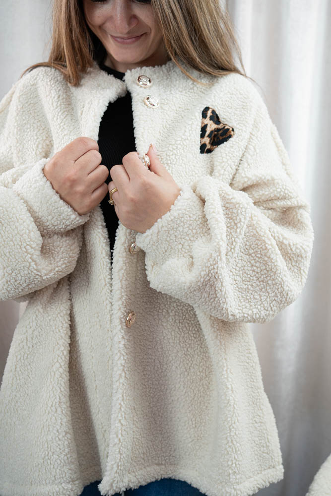 Super schöne Übergangsjacke aus Teddystoff mit edlen Manschettenknöpfen und Leo Herz Applikation, sowie seitlichen Eingriffstaschen - hergestellt in Italien.