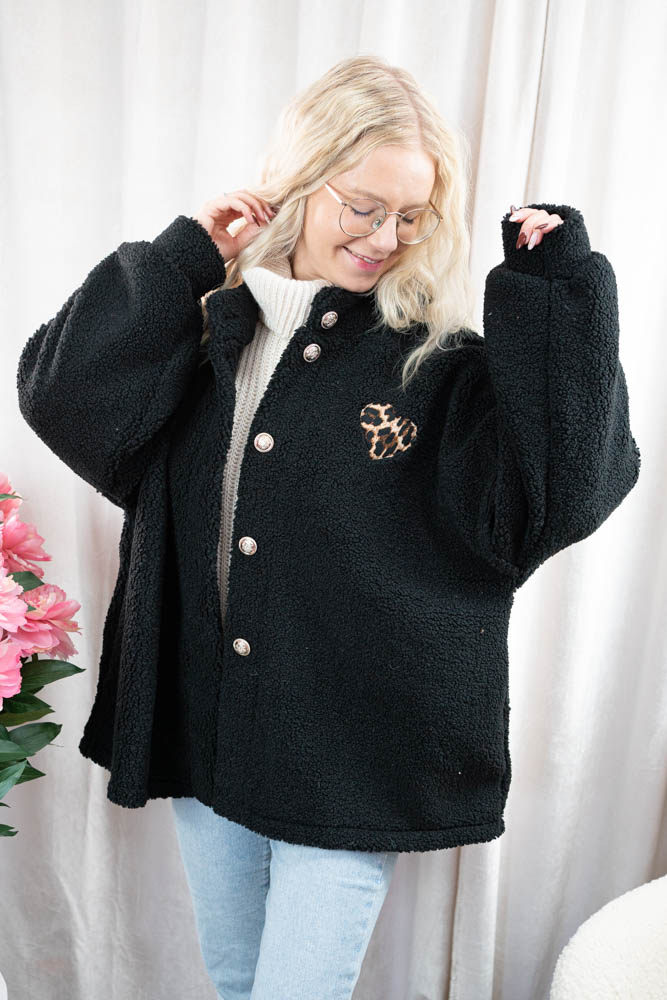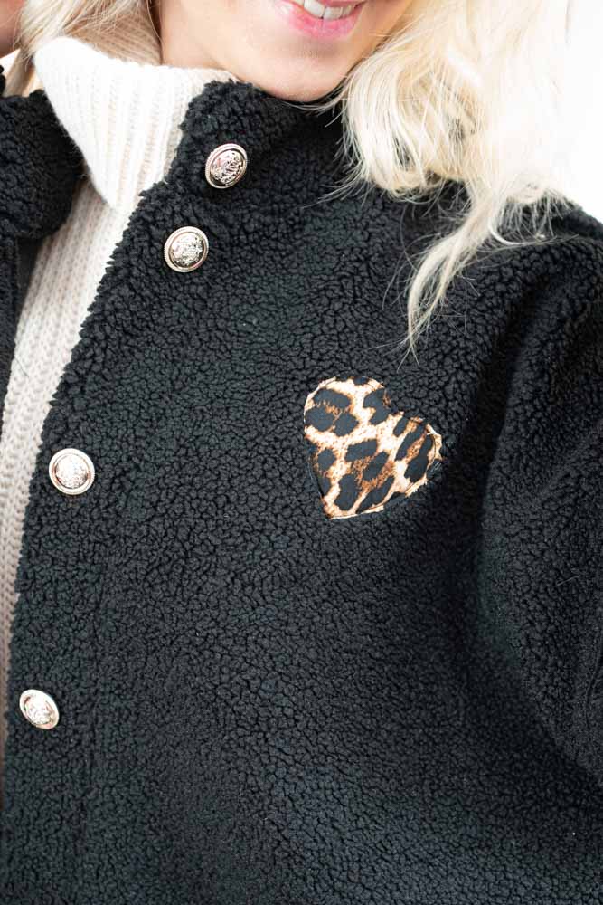 Super schöne Übergangsjacke aus Teddystoff mit edlen Manschettenknöpfen und Leo Herz Applikation, sowie seitlichen Eingriffstaschen - hergestellt in Italien.