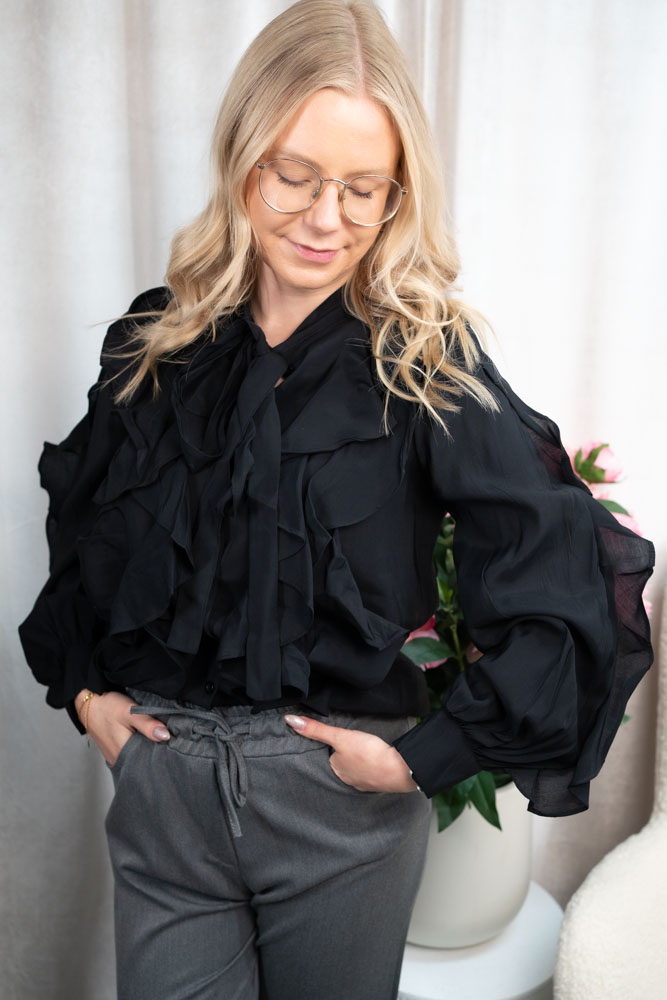 Locker geschnittene Bluse mit Volants und einer Schleife am Kragen.
