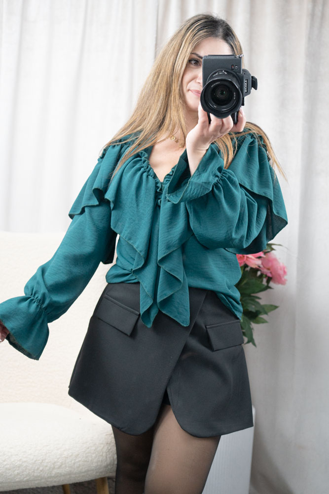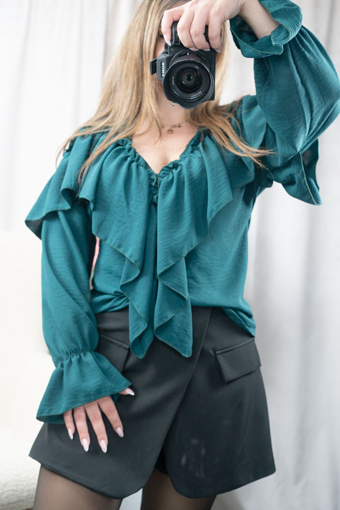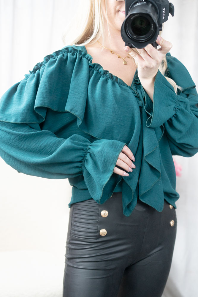 Locker geschnittene Bluse mit Volant und zartem Gummi am Ärmel.