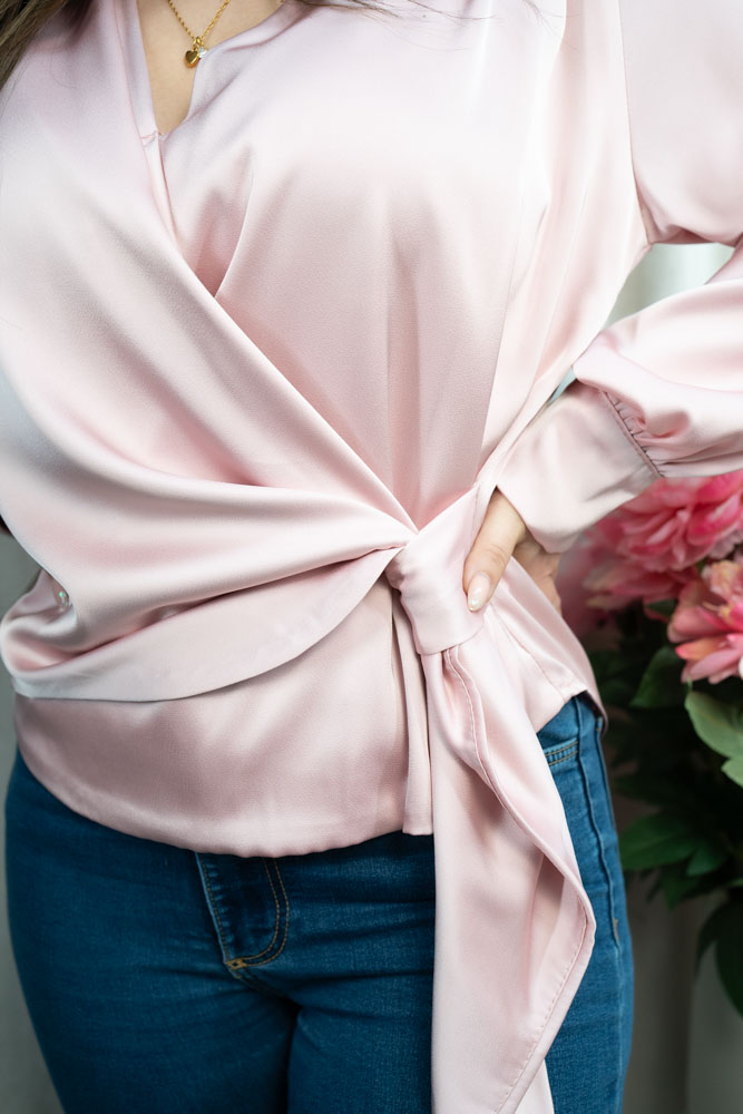 Locker geschnittene Wickelbluse mit Knoten vorne aus einem schönen Satinstoff, wunderschön edel und fließend.